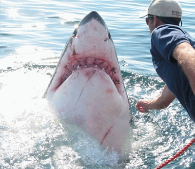 鯊魚的感激 這隻大白鯊就一直跟著漁夫,快樂地拍著水花 ....... 他救了牠,一起悠游嬉戲於海上。